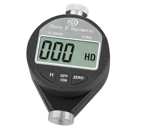 El durómetro digital es un aparato compacto para la comprobación de la dureza Shore D, que se necesita para materiales un poco más duros, como por ejemplo, goma dura y plástico térmico. Como cuerpo de penetración de durometro digital se usa un cono de 30 º y una fuerza de presión de 50 Newton. Las pruebas de medición deberían tener un espesor mínimo de 6 mm. En caso que sea inferior, el material a comprobar debería ser reforzado en la parte posterior con el mismo material, consiguiendo así aumentar el espesor.